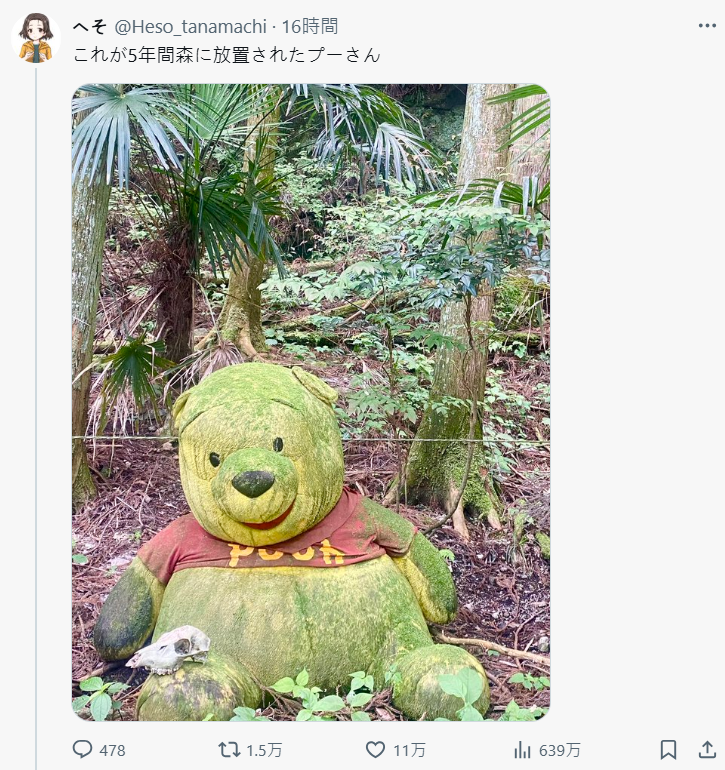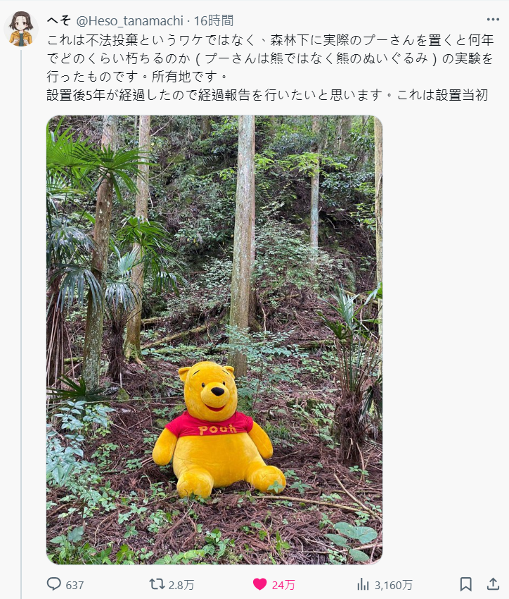 一位名為へそ(@Heso_tanamachi)的日本推主,近日在 X 上分享一項奇特的長期觀察實驗。他將一隻「小熊維尼」的絨毛娃娃放在自家森林中,觀察它經歷時間與自然環境洗禮後的變化。這隻娃娃自五年前設置至今,他也公開了擺放的結果,瞬間成為網友熱議的話題。