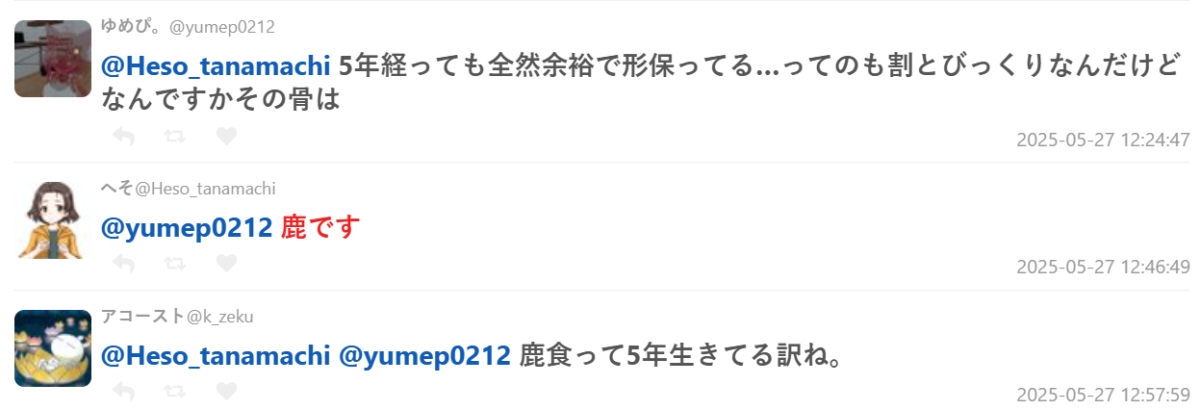 有網友發現畫面中竟出現不明頭骨質問 : 「那不是骨頭嗎?」,原 PO 回覆:「那是鹿的。」,另有網友開玩笑說 : 「原來是吃了鹿才活了五年嗎 w?」