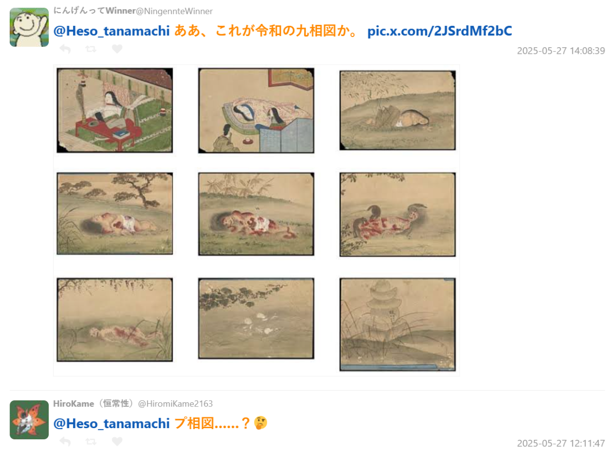 許多網友對小熊維尼娃娃保有形體感到震驚,感嘆「這材質也太耐」、「這種化學纖維真的不容易分解」,也有網友聯想到佛教中描述人體腐壞過程的「九相圖」,稱這是「令和版九相圖」、「プ(ぷ)相圖」。