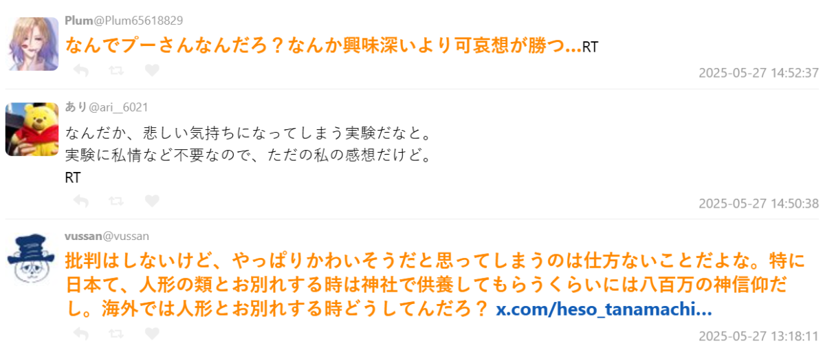 部分網友對這樣的實驗感到惋惜,認為將絨毛玩偶獨自放在山中是一件「太寂寞、太殘忍」的事。「我覺得玩偶會動,像《玩具總動員》一樣,所以看到這個畫面真的讓人心痛」、「希望有人能幫他好好供養一下」、「我不會批評,但我真的覺得他很可憐」。日本人對人形、玩偶寄託情感之深,也成為討論焦點。