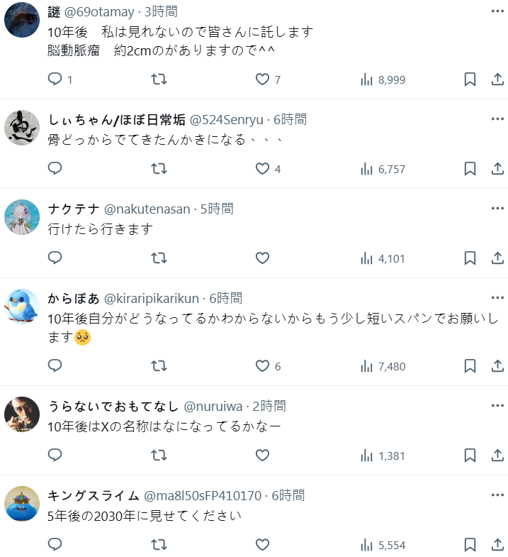 原 PO 表示實驗將持續下去,預計會在第 10 年再次公布觀察成果,並笑稱「我們十年後見」。有網友則半開玩笑提醒:「X 到時候還在嗎?記得先截圖備份」、「我十年後可能看不到了,請大家替我欣賞十年後的景象」。