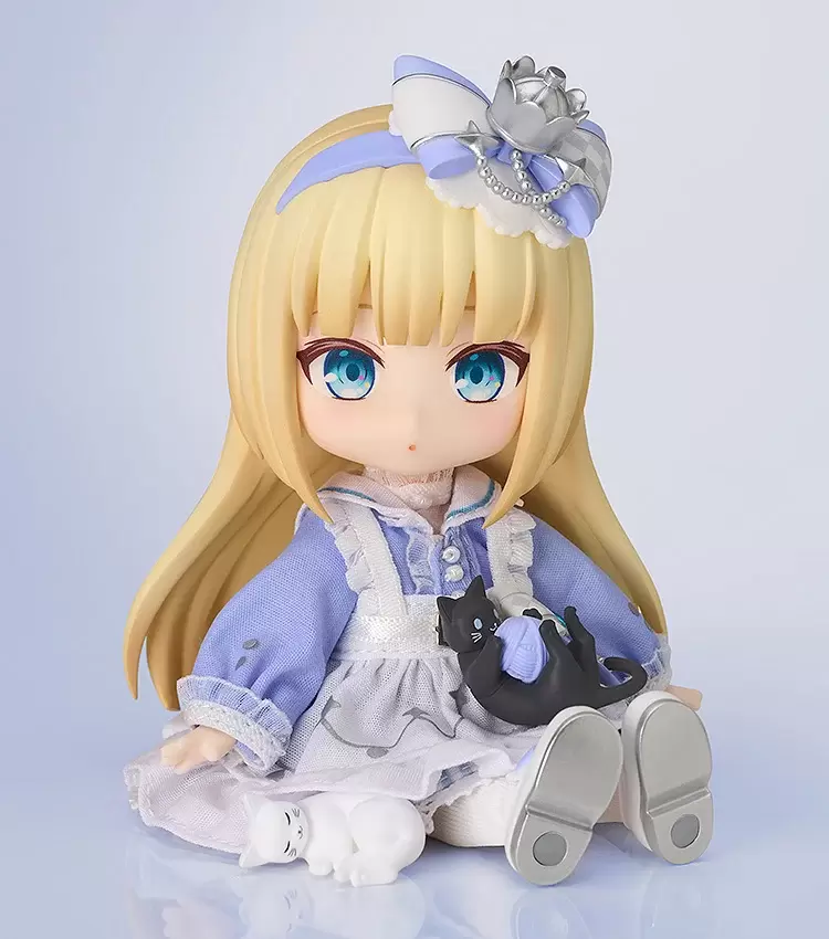 服裝部分包含連身裙、圍裙、膝上襪、內褲等都使用布料縫製而成,同時再現了連身裙上可愛的黑白貓圖樣、圍裙的金屬扣與蝴蝶結裝飾等細節,能夠自由為愛麗絲替換可愛的穿搭造型。此外配件中還附上了玩毛線球的黑貓、睡得香甜的白貓,能與愛麗絲一同互動、展示。