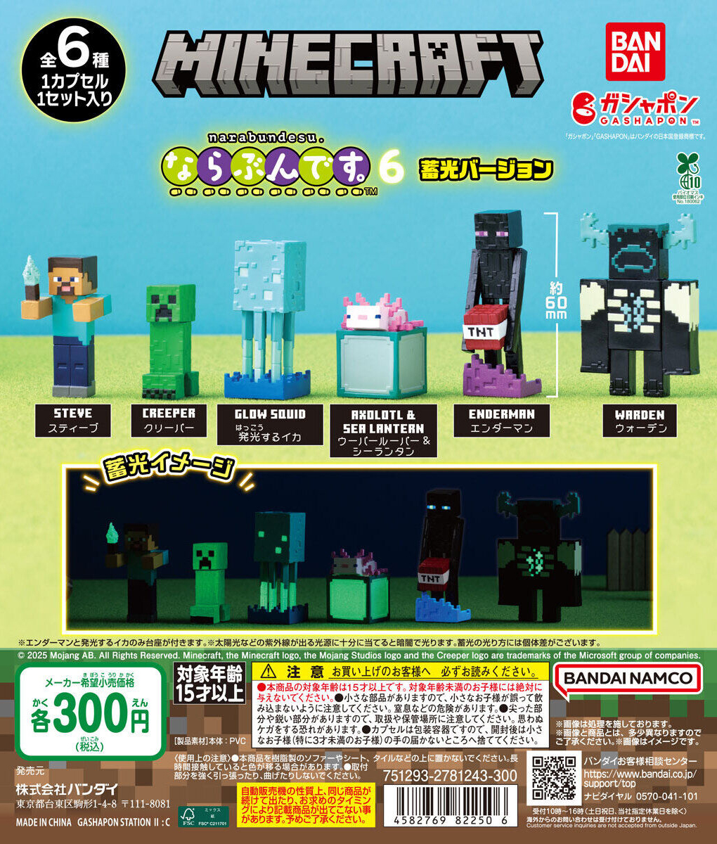 日本萬代玩具公司轉蛋事業部 GASHAPON 發行的排排隊(ならぶんです。)系列要在本(5)月發售以《Minecraft》為主題的最新商品「MINECRAFT 排排隊第六彈 蓄光ver.」(マインクラフト ならぶんです。6 蓄光ver.)轉蛋!一共有六種款式可以收藏,建議售價為每轉 300 日幣。
