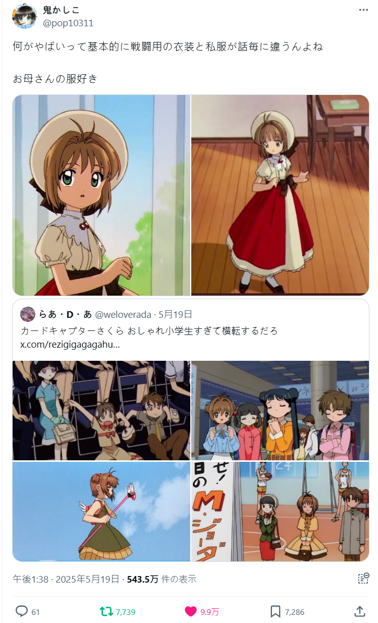 但其實動畫也有用心的案例,日本網友就點出經典 CLAMP 作品《庫洛魔法使》,動畫組讓「小櫻每集不同造型」的驚人製作細節上,讓不少網友直呼「像這樣的用心動畫組就真的讓人折服!」,引起網友熱議。