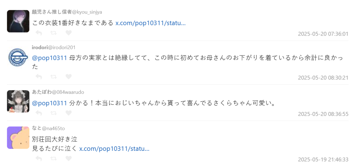 有網友補充:「這件衣服是小櫻第一次穿媽媽的舊衣,特別有意義」、「從爺爺那收到衣服,小櫻開心得要命,真的好可愛」,甚至有人表示每次看到別墅篇都感動到落淚。