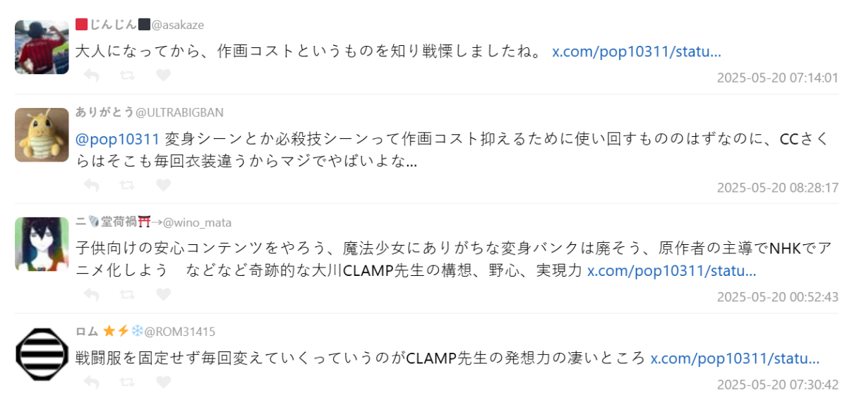 也有資深粉絲補充:「《庫洛魔法使》原作大川七瀨(CLAMP成員)當年親自主導動畫製作,雖說在 NHK 上播放,不只要迎合孩童向風格,還拒絕使用常見的魔法變身片段、選擇讓角色每次實際換裝,就是想跳脫既有框架。」