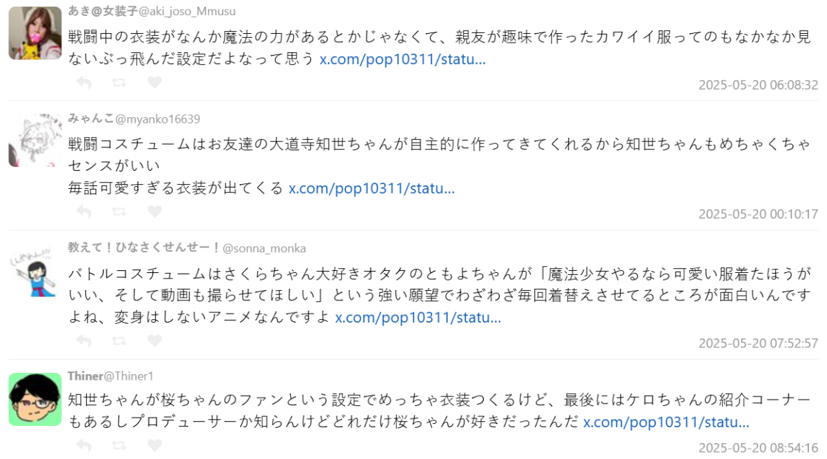 引起討論的推主 PO 文表示,並非動畫組做不出像樣的設計,像《庫洛魔法使》這樣的作品,能讓小學生都穿得如此美麗又時髦,真的是讓人感到欣喜。