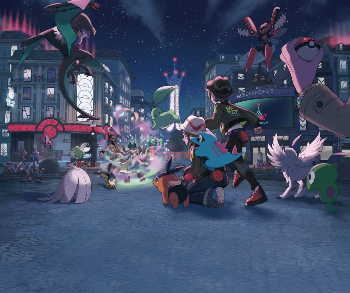 官方同步公開封面藝術圖,畫面中主角與夥伴寶可夢在夜晚的密阿雷市街頭對抗超級進化寶可夢,透露出本作將聚焦於「超級進化」主題的戰鬥與劇情。