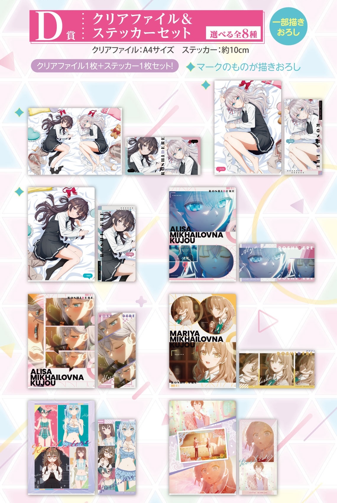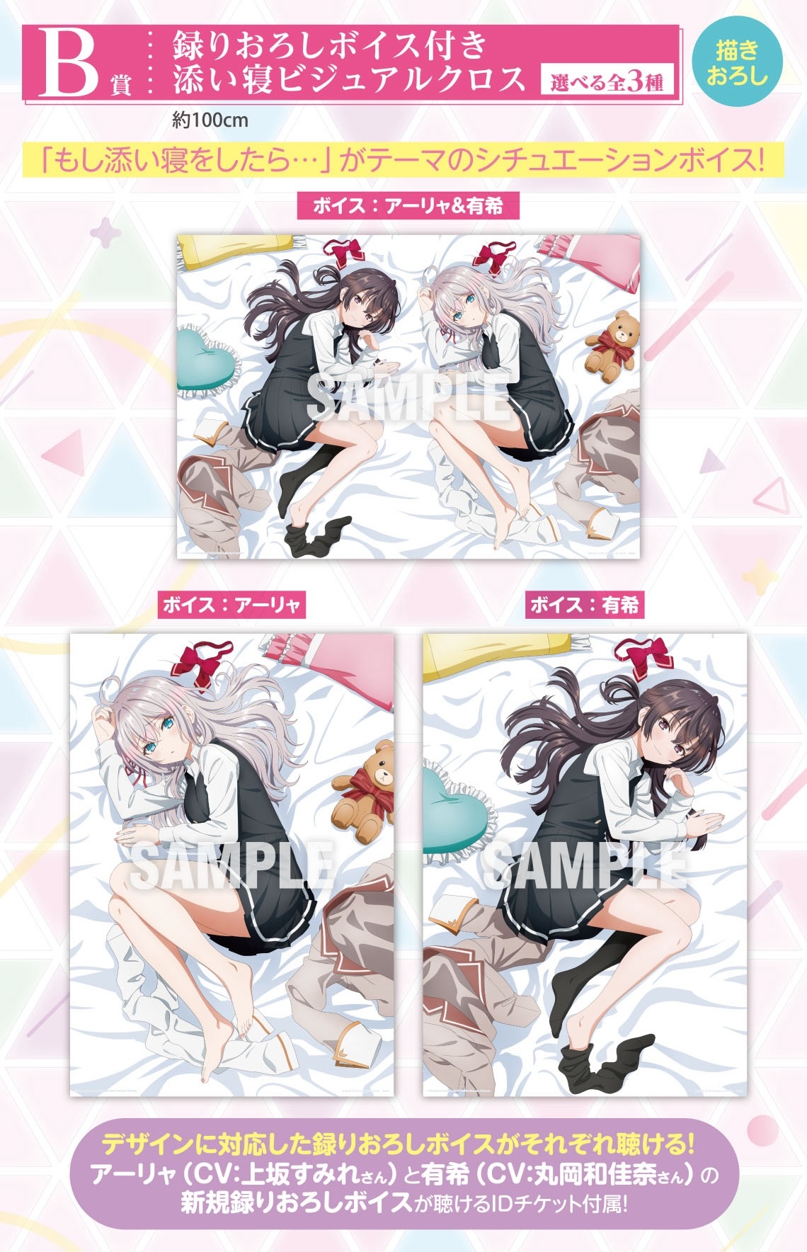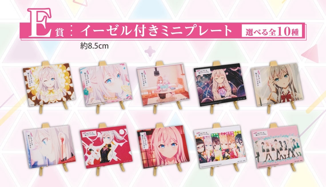 B賞為錄製語音版本的視覺掛布,收錄艾莉的聲優上坂堇以及有希的聲優丸岡和佳奈錄製的語音,提供視覺及聽覺的雙重享受!C~F賞分別為艾莉的ちょこのっこ(Q版角色模型)收藏、透明文件夾與貼紙組、附畫架的迷你擺飾盤以及橡膠吊飾,小賞部分的插圖都印製有許多劇中的其他人氣角色,喜歡遮羞艾莉的各位玩具人千萬不要錯過!
