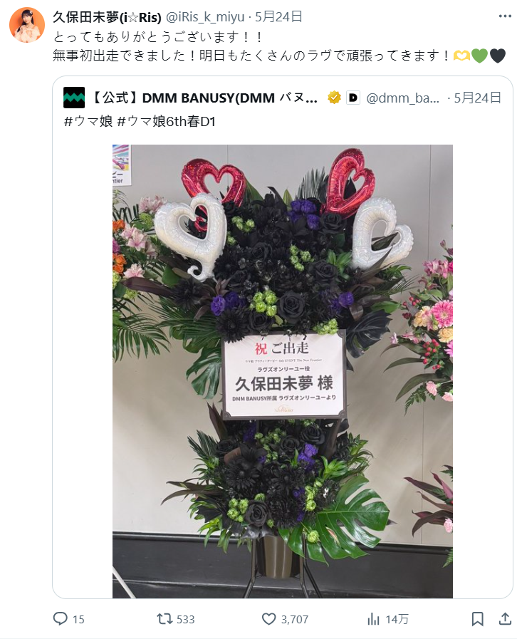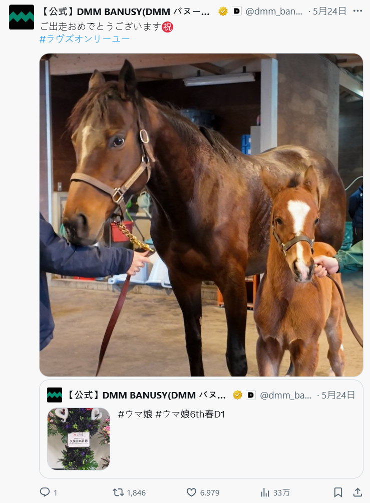 負責唯獨愛你馬匹相關事務的 DMM BANUSY 官方 X也貼出花束和馬兒目前的生活照,並發文祝賀:「恭喜出賽!」。