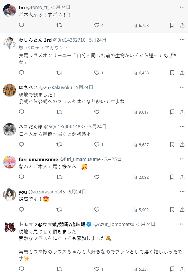 粉絲們也紛紛在社群上留言:「這也太厲害了吧」、「本尊送花給自己聲優這什麼神仙劇情」、「能看到實馬跟馬娘聲優有這樣的互動連結,真的很感動」,也讓人看到這溫暖情節。