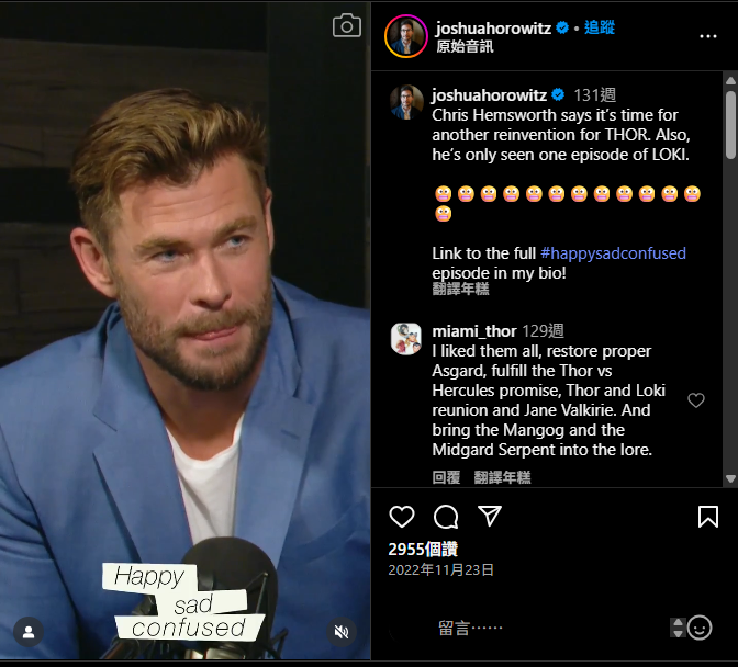 這段話語感性又不乏告別意味,立刻引發外界對於他是否將在《復仇者聯盟:末日之戰》中最後一次飾演雷神的猜測。