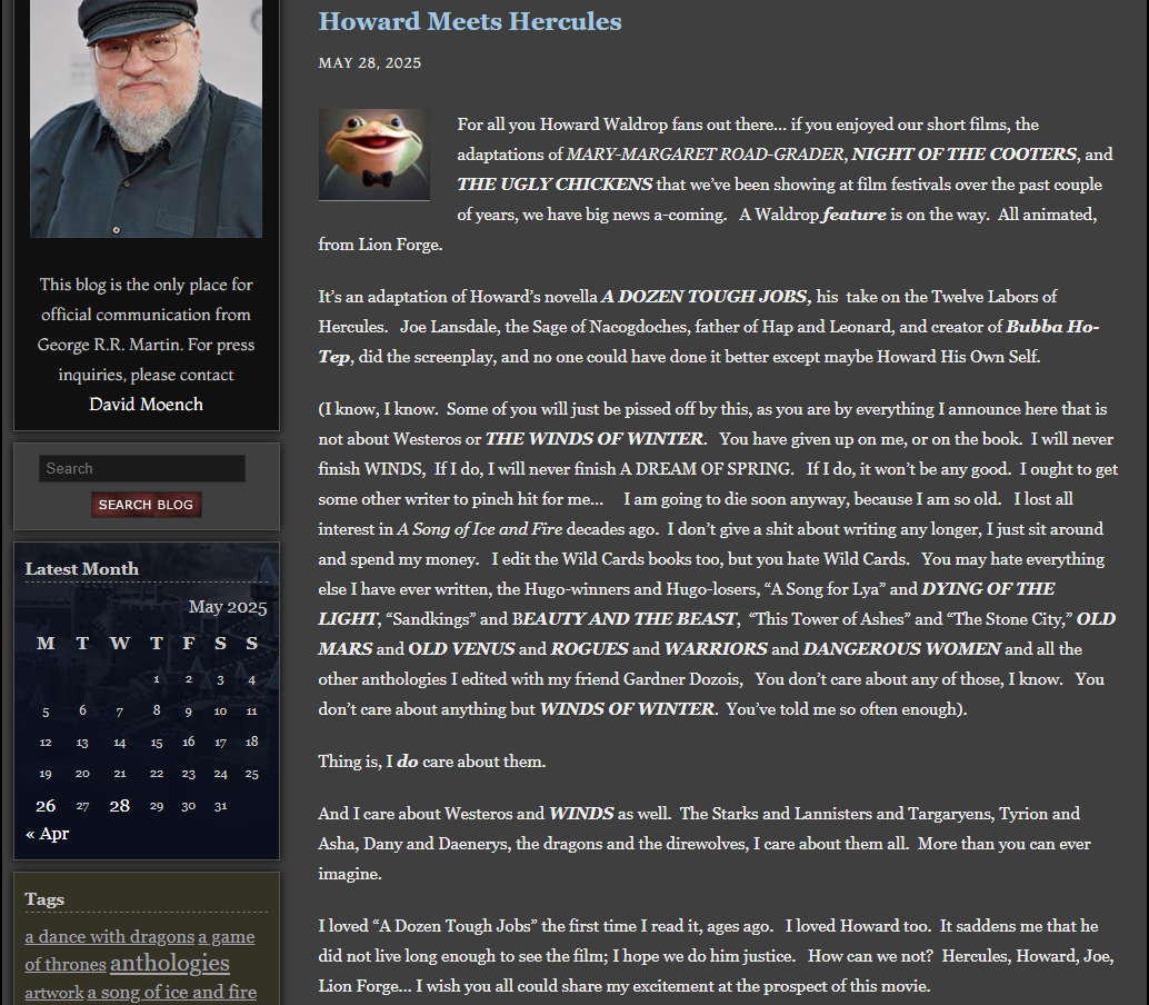 這次他宣布將監製一部改編自已故好友,同時也是知名科幻作家霍華·華德羅普(Howard Waldrop)小說的全新動畫電影。然而,比起新作品本身,更引發關注的是他在文中主動回應粉絲對《寒冬冽風》(The Winds of Winter)遲遲未完成的批評聲浪,而且語氣強硬、毫不客氣。