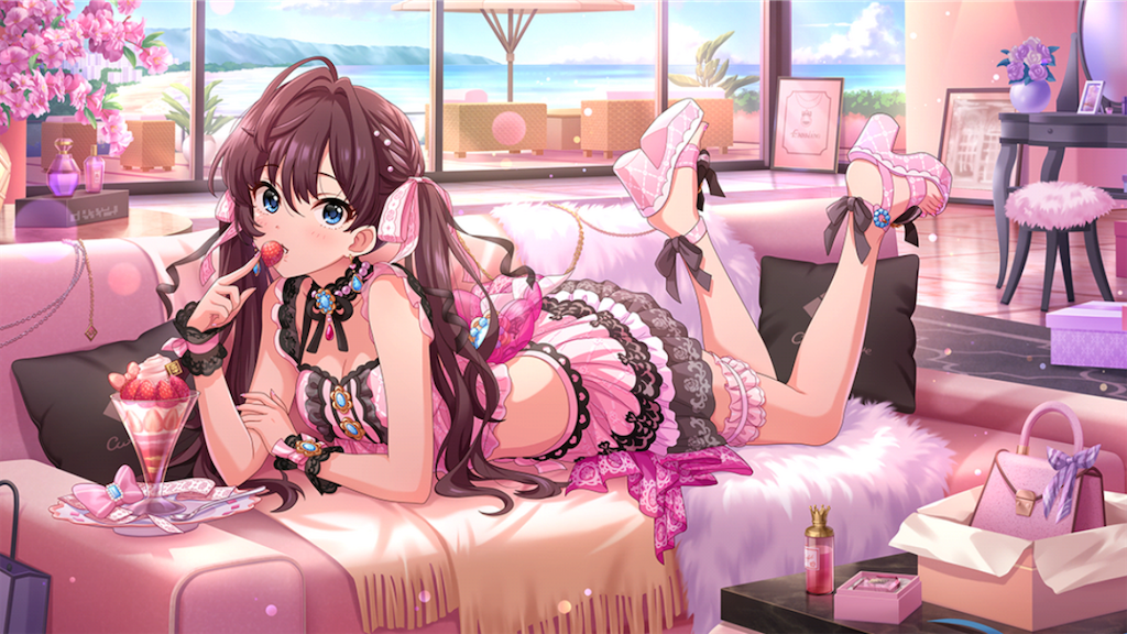 而場景部分不僅僅是製作出粉紅色沙發,更還原沙發上披掛的布料、金鍊、靠枕等豐富物件,其中最引人注目的就是那杯超級寫實的草莓百匯,細膩還原了草莓凹凸的表面、杯中草莓與鮮奶油的分層,志希嘴邊那顆草莓更有著晶瑩剔透的光澤感,結合纖細的指尖、水嫩的雙唇凸顯志希的可愛。