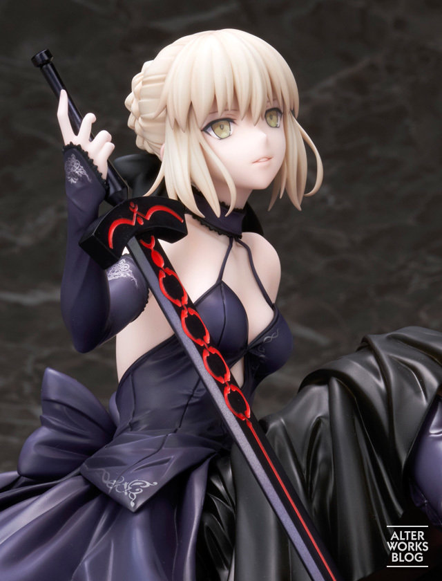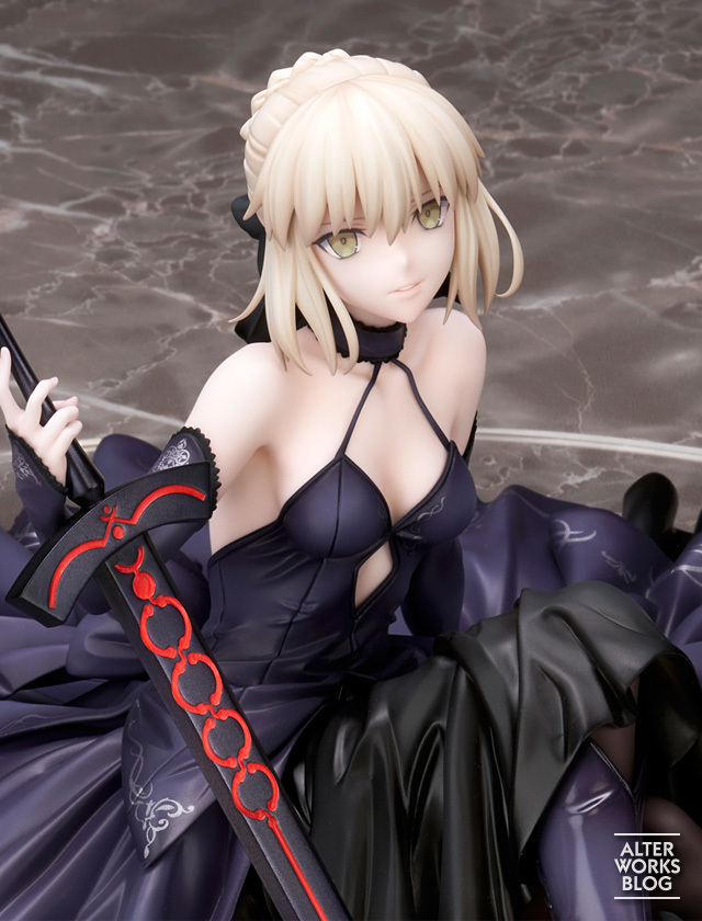 整體造型細膩雕塑出黑 Saber 纖細美麗的 S 形身材曲線,帶有一絲輕蔑與冷淡的微笑呈現與阿爾托莉亞相反的魅力,手中的誓約勝利之劍使用彩度極高的紅色塗裝紋路細節,表現原作充滿邪氣的黑暗世界觀。
