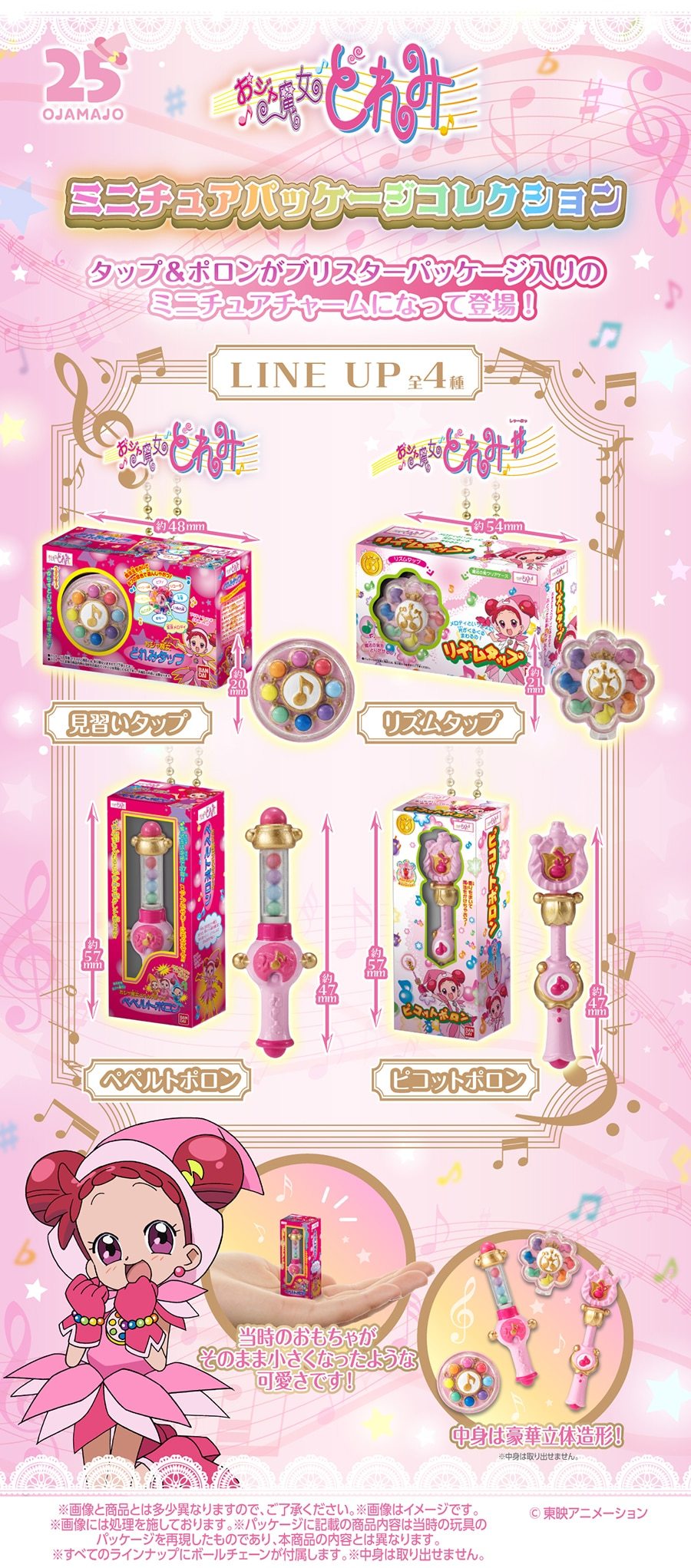 本次的「小魔女DoReMi 迷你玩具收藏」 微縮模型吊飾轉蛋以吊飾形式還原萬代當年推出的《小魔女DoReMi》主題商品,在每款約3.2~5.7公分的迷你尺寸下將商品從包裝盒到玩具本身都做了出來,內部的商品以立體模型呈現並還原了包裝裡的泡殼,細緻的重現了當年包裝盒上的各種印刷,提供見習生變身轉換器、旋律變身轉換器、貝貝魯多波龍以及花邊波龍共四種款式,雖然形式上與先前推出的「波龍變身轉換器收藏」系列類似,但在比例上更可愛一些,不論是作為收藏擺設或是當作吊飾掛在背包上都是可愛加倍!當年錯過的玩具人不要再錯過這次機會啦!