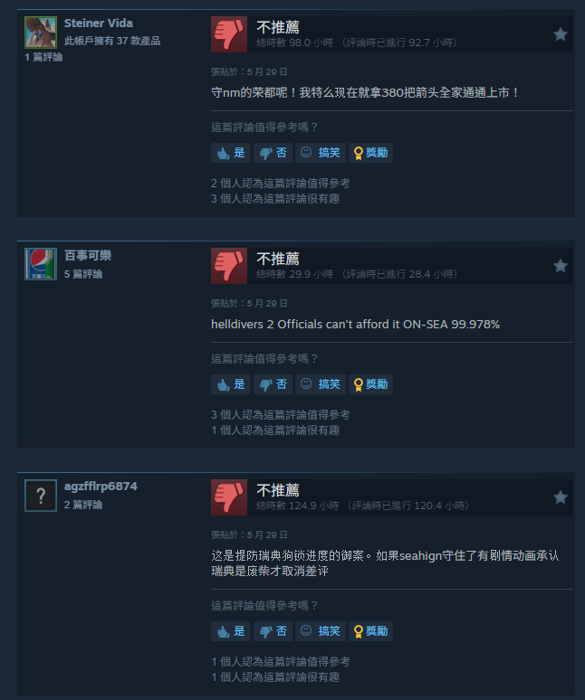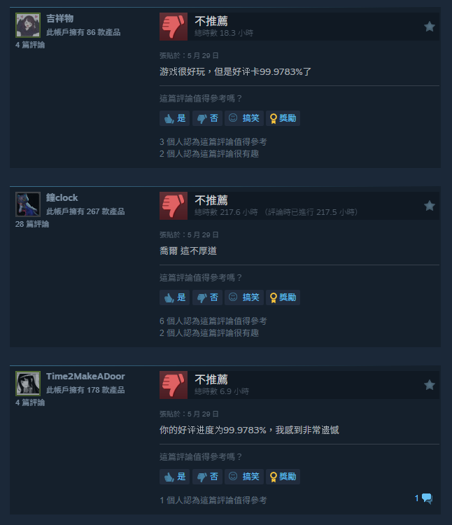 這也引爆玩家怒火,截至目前,《絕地戰兵2》在過去24小時內收到超過2,300則負評,其中絕大多數來自中國玩家,頻繁提及「99.9783%」、「劇情操控」、「失望」等關鍵詞。儘管這波負評尚未達到2024年5月因PSN綁定問題造成的評論風暴規模,但足以顯示玩家對劇情透明度與社群參與感的高度敏感。