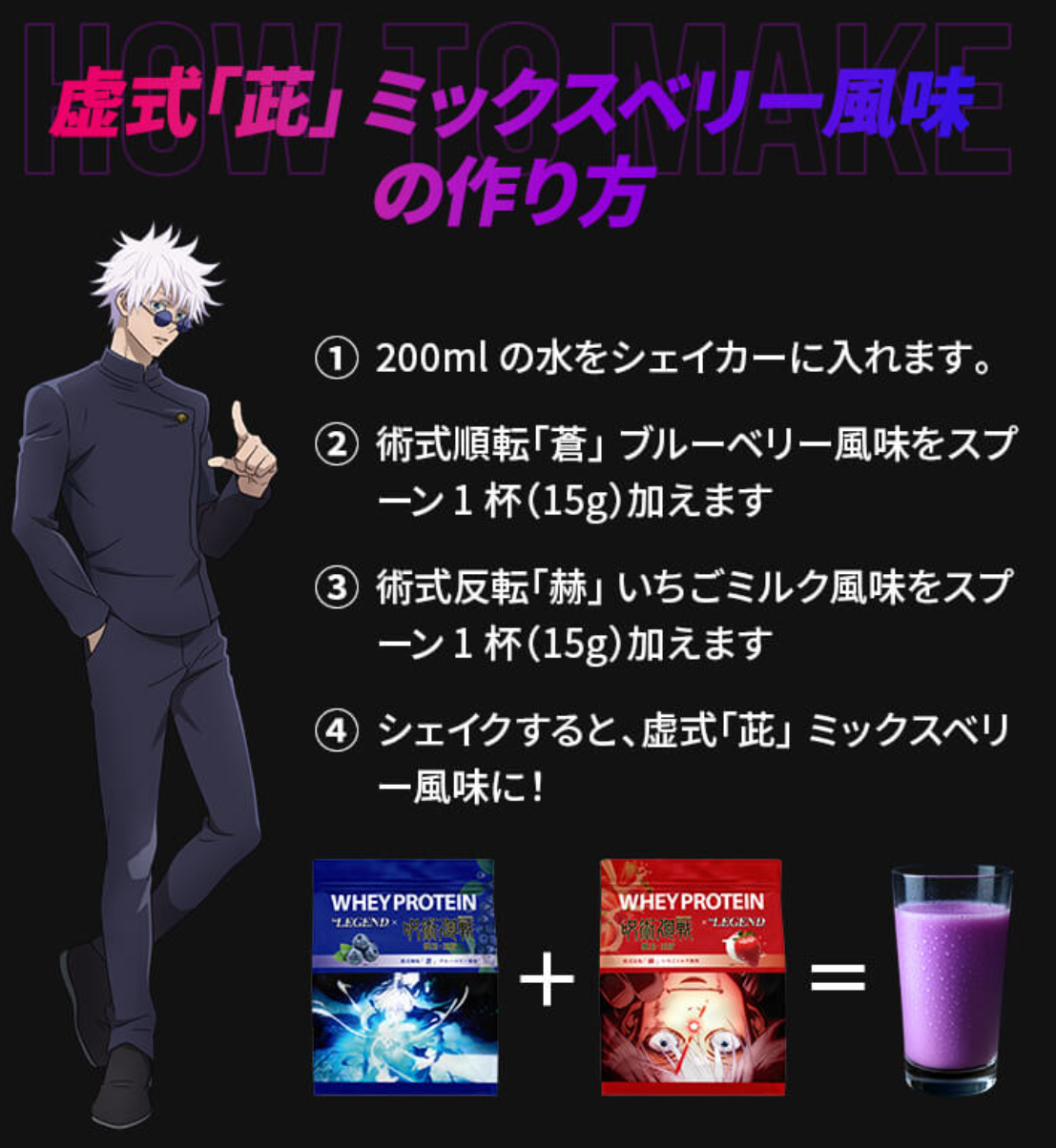 雖然單喝也非常好喝,但官方特別推薦,效法五條悟將這兩款各取一匙(約 15g )混合,就會變成紫色的「虛式・茈」綜合莓果風味蛋白粉。一口下去,彷彿讓你感受到那句經典五條台詞「天上天下,唯我獨尊」,讓你整個人都覺醒!
