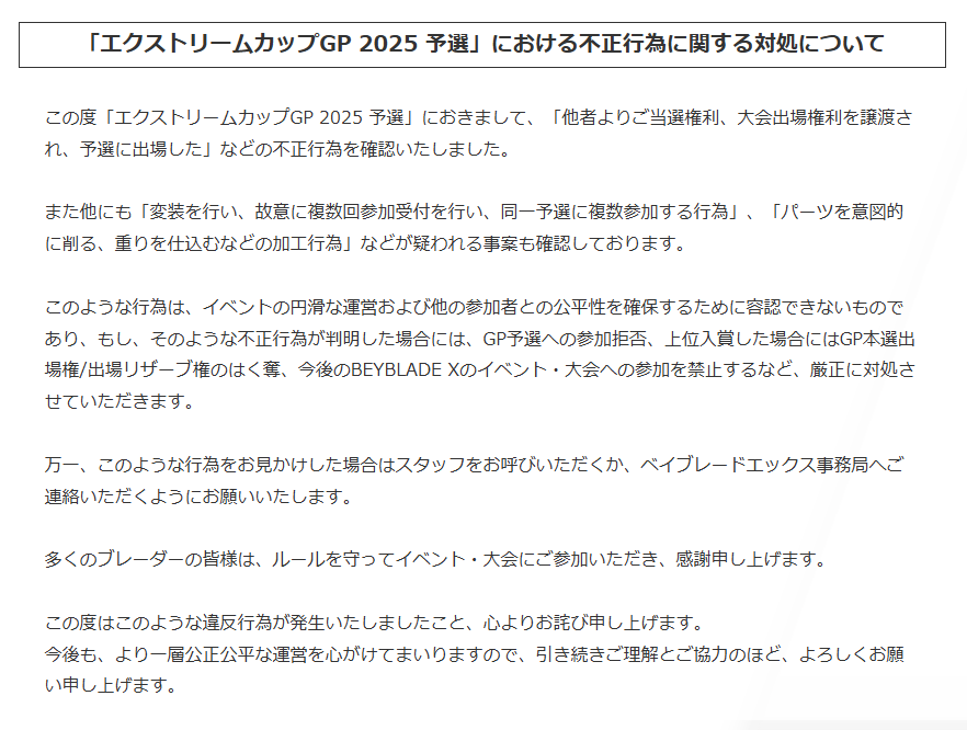 不過近日 ( 5/30 ) BEYBLADE 官方 X 發布公告,指出在年度賽事「X-TREME CUP GP 2025」預賽中,有參賽者進行不正行為,因此特別提醒大家務必遵守比賽規則。