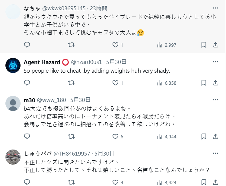 也看得出日本網友不少人也在吐槽戰鬥陀螺比賽越來越像漫畫裡的世界,不只有改造、還有作弊、偷陀螺的亂象,現在居然還有人變裝為了重複報名增加分母勝率,引起不少網友憤怒或苦笑的回應。