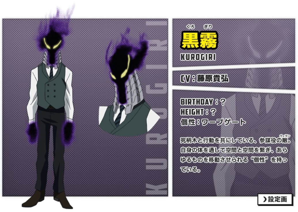 「黑霧」為「敵人聯軍」的領袖輔佐。身體被黑霧包住,頭上穿戴護甲,穿著西裝的男性,常以周到殷勤的語氣說話。看似像沒有實體的煙霧人,但其實是用黑霧將實體包裹覆蓋住,個性「空間跳躍門」能透過黑霧構成異空間的通道傳送大量的人到目的地。