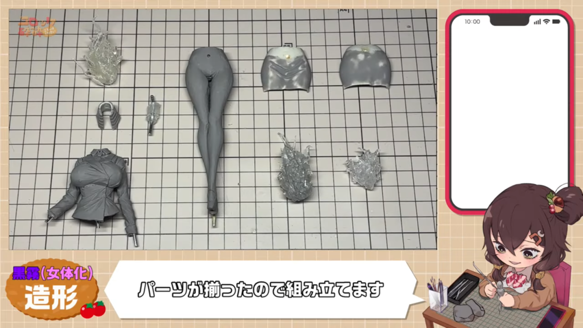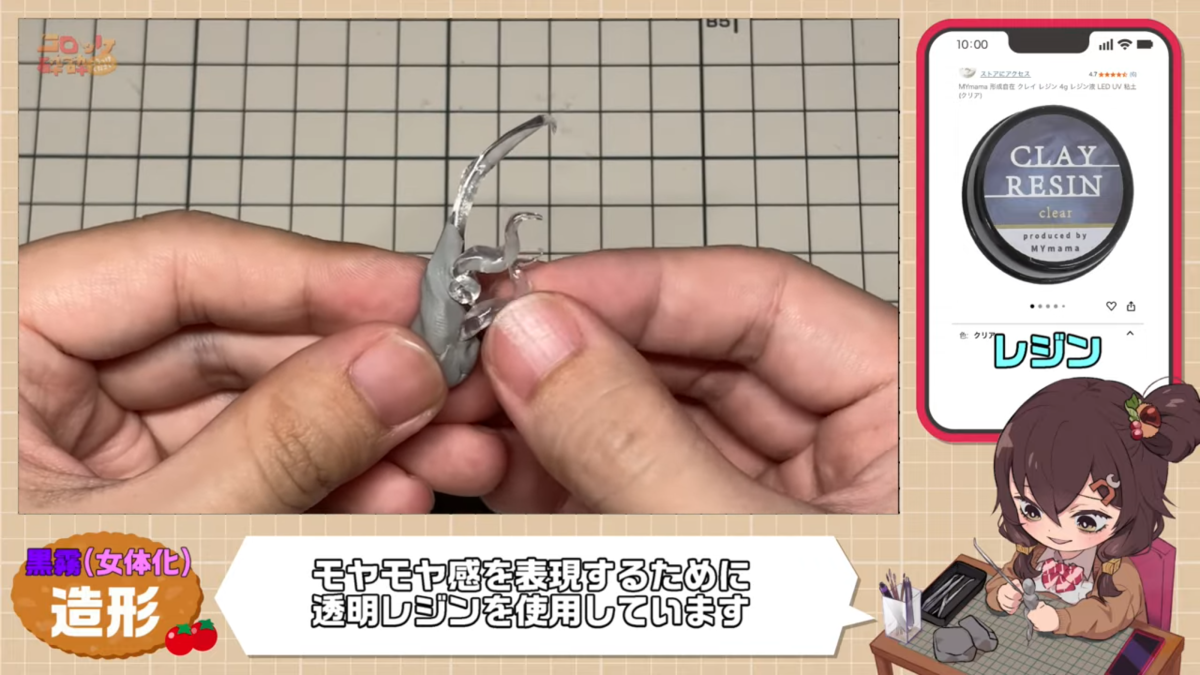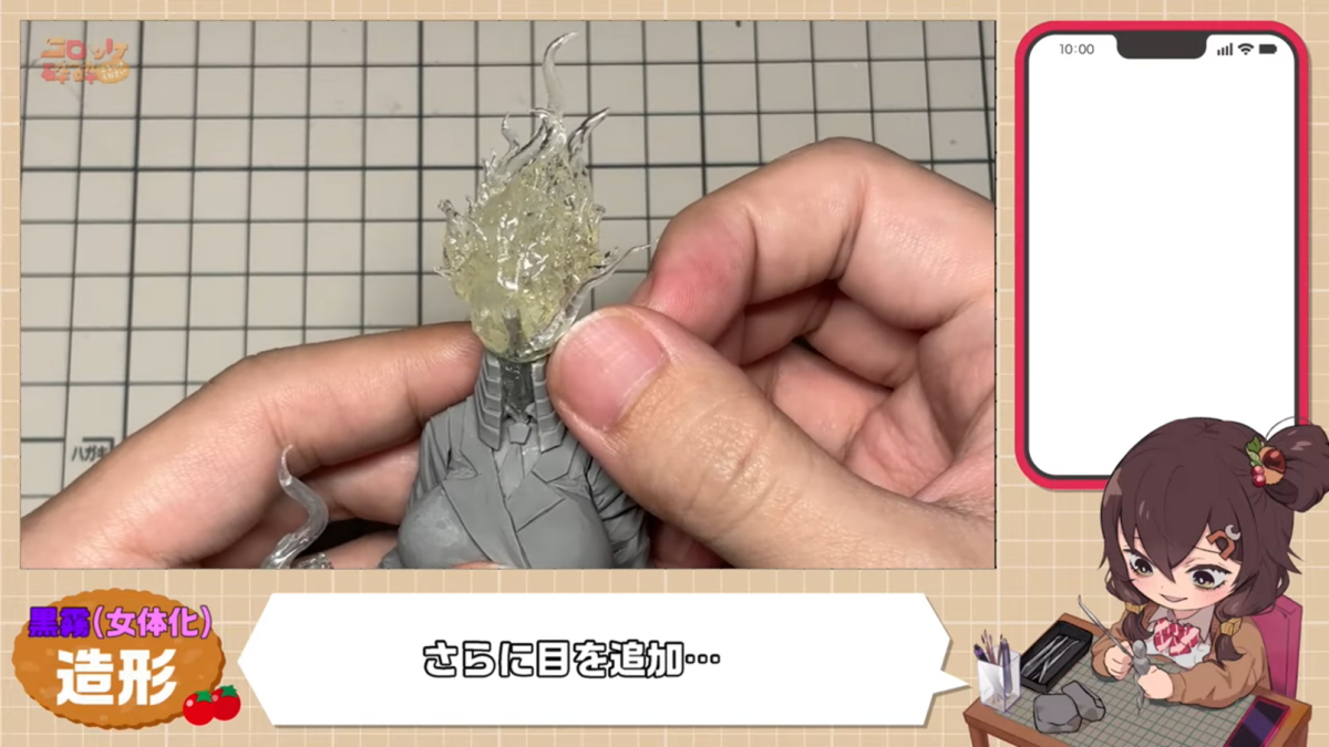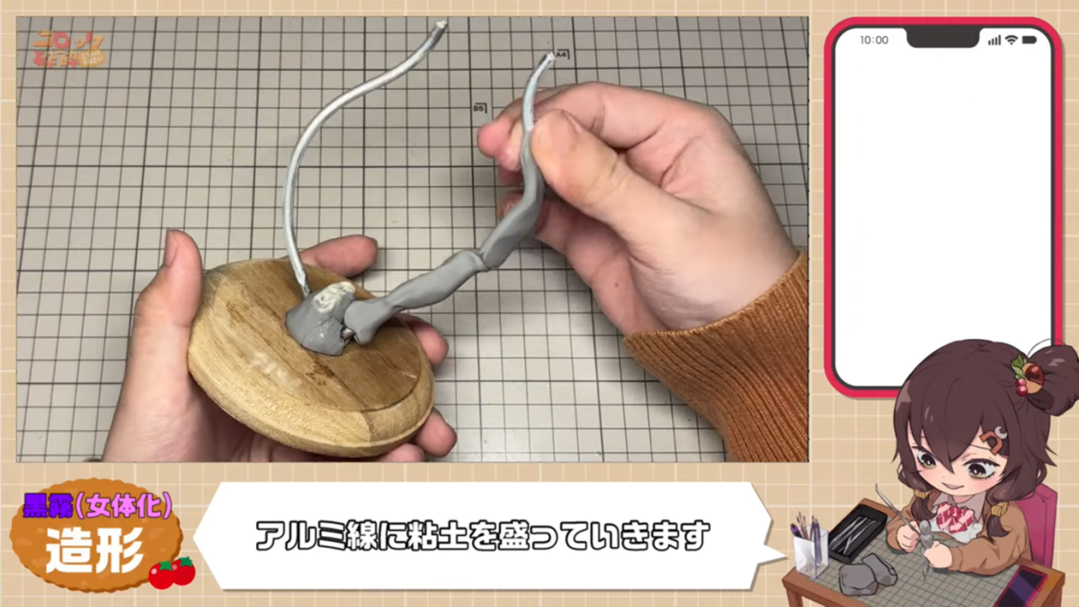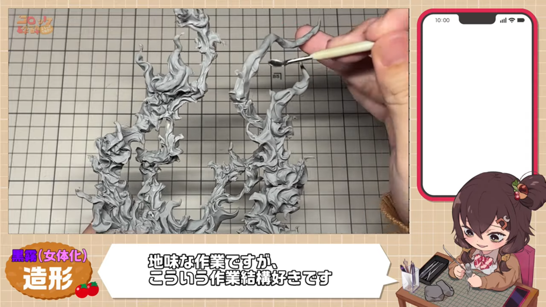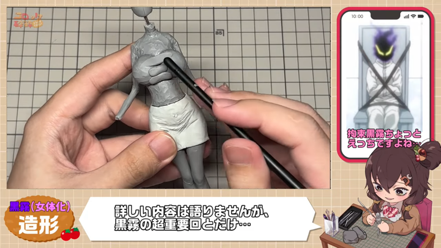 一樣透過黏土與鐵絲來捏出人形,從基礎的身體製作起步,コロッケ砕砕表示,《我的英雄學院》的角色設計都很有魅力,自己認為敵人聯盟的成員都十分有特色。這次想要把「女體化」的身材強調出來,想把原先穿著正裝的黑霧塑造成 OL 的形象。