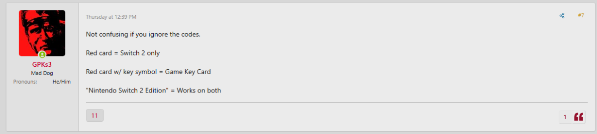 ▼有玩家認為:「如果你不管那些代碼,其實一點都不混亂。紅色卡匣 = 僅限 Switch 2 使用;紅色卡匣+鑰匙符號 = Game Key 卡;標示「Nintendo Switch 2 Edition」= 可在兩代主機上使用」