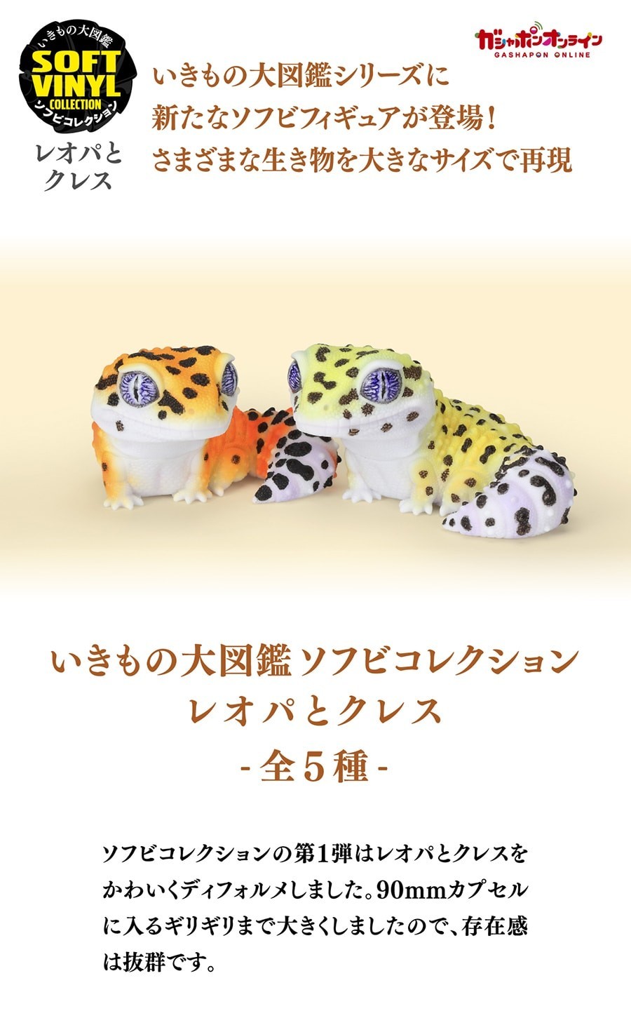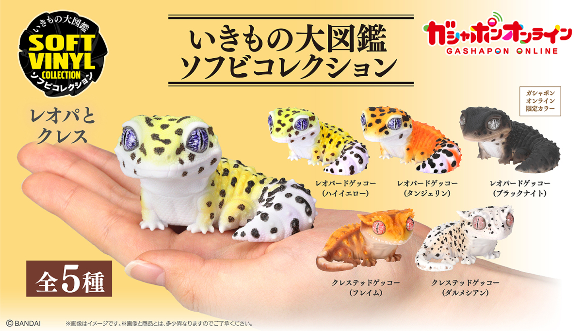 在日本萬代公司轉蛋玩具品牌 GASHAPON 所推出的「生物大圖鑑」支線系列「生物大圖鑑 軟膠收藏」,將推出最新商品:「生物大圖鑑 軟膠收藏 豹紋壁虎與睫角守宮」轉蛋!共有五種款式,一轉參考售價為 500 日圓,預計於 2025 年 09 月開轉。
