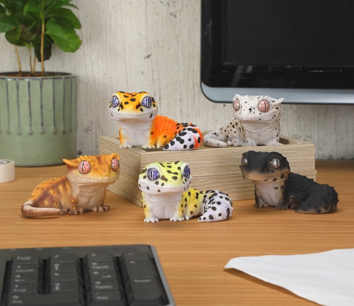 軟膠系列首彈「生物大圖鑑 軟膠收藏 豹紋壁虎與睫角守宮」轉蛋,將人氣爬寵化為約 8 公分的掌中尺寸,由真工房擔任原型,擬真地再現睫角守宮頭部如王冠般突起與豹紋壁虎的棘皮細節,並由三浦二郎老師負責塗裝,細膩還原大眼睛的紋理和充滿特色的花色、斑點,整體可愛卻保持逼真。收錄有:豹紋壁虎(黃)、豹紋壁虎(橘)、豹紋壁虎(黑),睫角守宮(Flame)、睫角守宮(大麥町),捧在手心上份量十足~