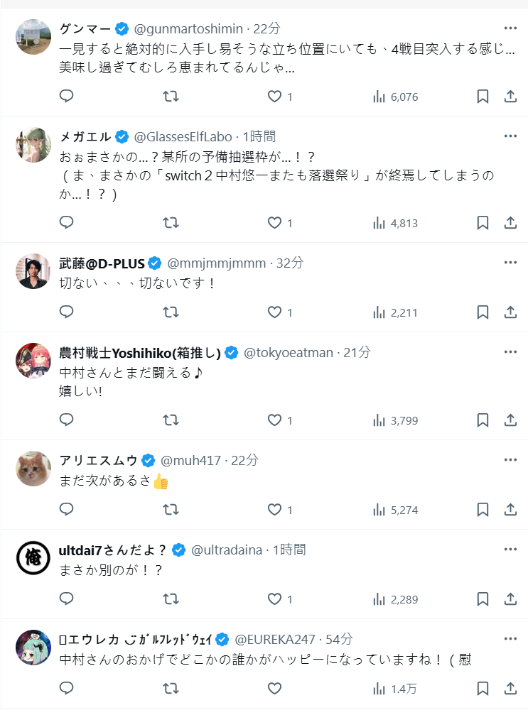 雖說中村悠一先前因為沒抽到 Switch 2 在 X 上掀起一波好友絕交的玩笑,結果沒想到已經第三波還是...落選,或許該說任天堂的抽選真的是公平,還是中村悠一真的是運氣很背,不適說好事不過三的嗎 ( ? )。看來未來第四波公布,勢必大家還是會關注中村悠一是否能轉運成功中選了吧...。