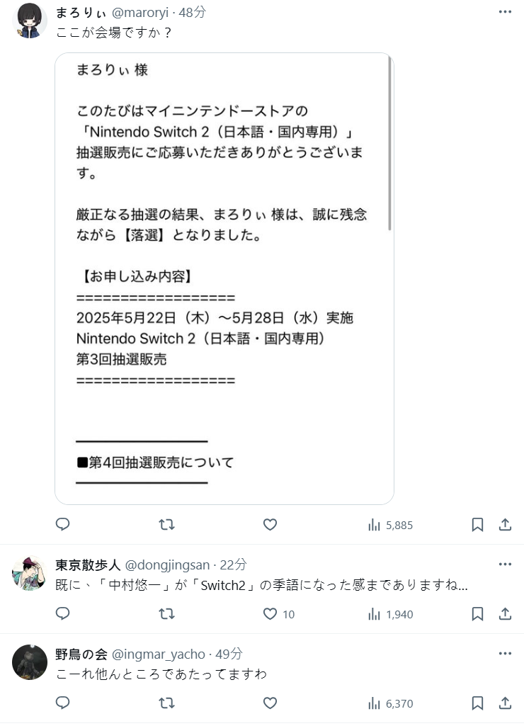 今日 ( 6/3 ) 是日本任天堂 Nintendo Switch 2 抽選第三波結果公布的日子,雖說距離正式發行也沒剩多少日子,但 X 上再次湧現本次幾家歡樂幾家愁的狀況。