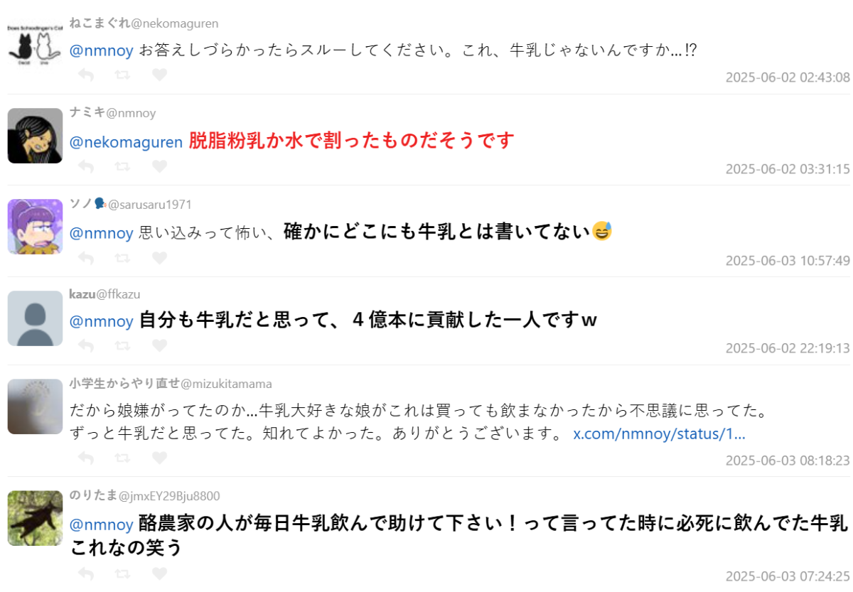有網友表示:「我也是貢獻4億瓶之一,還以為自己在喝牛奶!」也有人說:「我女兒超愛牛奶,但每次買這個她都不喝,我還納悶她怎麼挑嘴,現在終於知道原因了。」更有網友指出,在疫情期間或支持酪農時,他們拼命買這款飲品以「挺農民」,現在回想起來不禁苦笑:「當時努力喝的牛奶竟然是這個!」