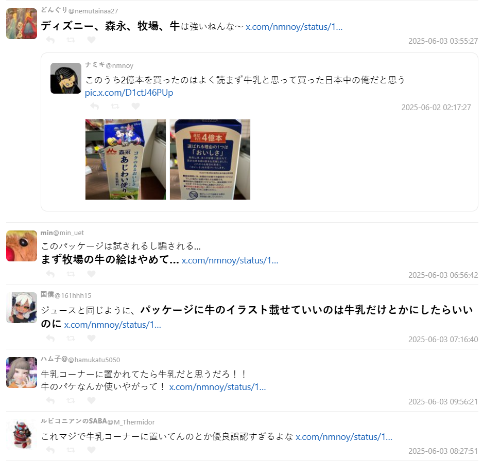 引起討論的推主發文表示:「外包裝標示著這款熱銷超過 4 億瓶,這 4 億瓶裡應該有 2 億瓶,大概是像我一樣沒仔細看、以為是牛奶就買下的日本人的吧。」貼文一出,引起廣大共鳴,網友紛紛驚呼:「什麼!?這不是牛奶喔!?」