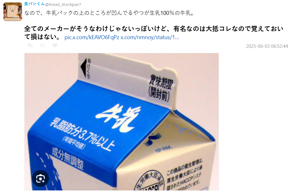 那到底要怎麼分辨在日本買的是牛奶還是乳飲品呢 ? 有網友分享辨別方法:「只有真正的牛奶,紙盒上方才會有缺角設計。」並呼籲大家多加注意,避免再買錯。