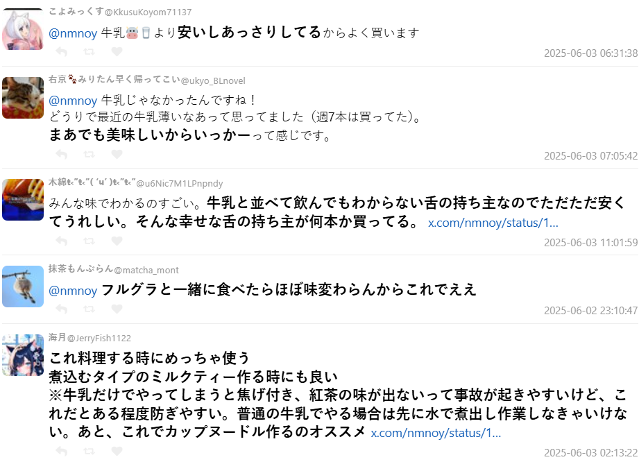儘管如此,仍有不少人表示這款乳飲品價格便宜又順口,會賣這麼好不是沒有原因的。不少人也認為 :「就算不是牛奶也沒關係啦,喝起來好喝就好了」、「跟水果穀片一起吃味道也差不多」,甚至被推薦作為料理用奶,像是煮奶茶、泡杯麵等也相當合適。