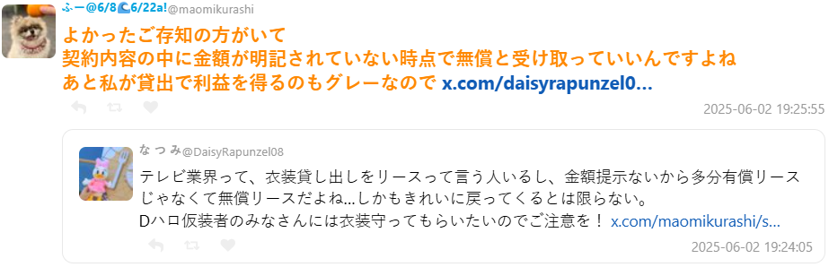 「ふー」收到來自電視節目製作單位的私訊,表示希望能「借用她的《冰雪奇緣》安娜服裝給藝人拍攝用」,但對方開出的條件卻僅是「會在節目中掛名致謝」,完全未提報酬、保險與借用細節,讓她大嘆電視台完全不尊重 Coser 付出的財力跟心力,看到網路上適合的就想佔便宜。