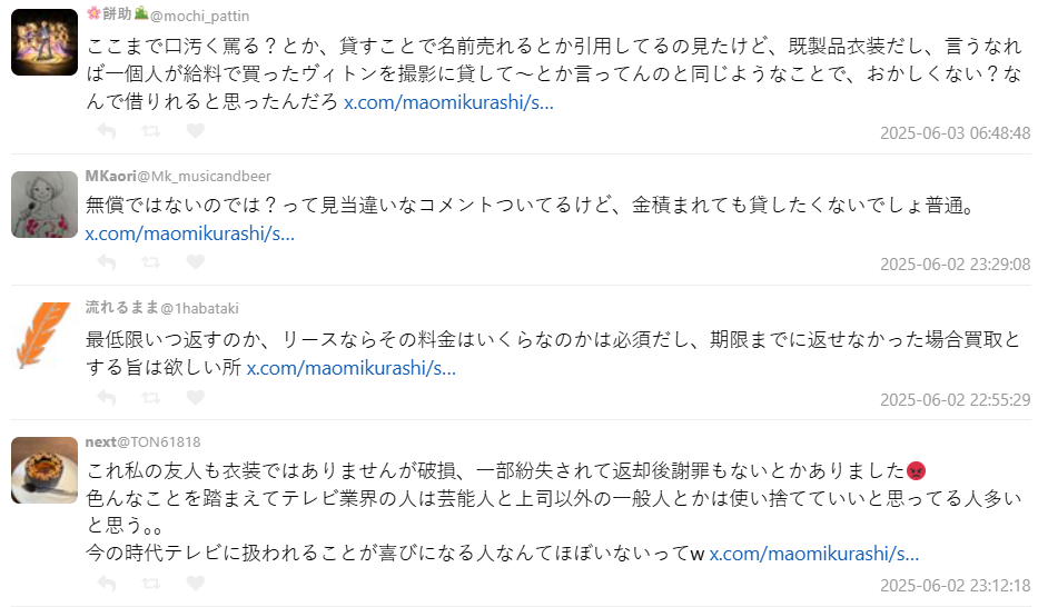 該事件再度引發網友對「電視台慣性輕視素人貢獻」的反感,許多人呼籲 Coser 們「再怎麼信任也千萬別無償借出貴重服裝」。