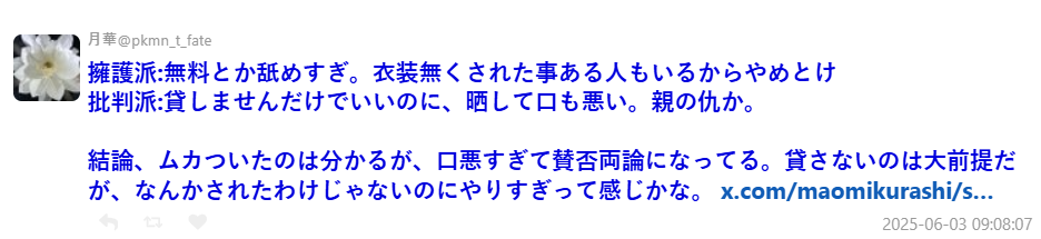 不過也有少數聲音認為,「不想借可以直接拒絕,不需要這樣公開發文罵人,口氣太兇會造成兩極反應。」對此,有支持者則回應表示:「會覺得她講話兇,是因為你不知道這些衣服對她有多重要。」