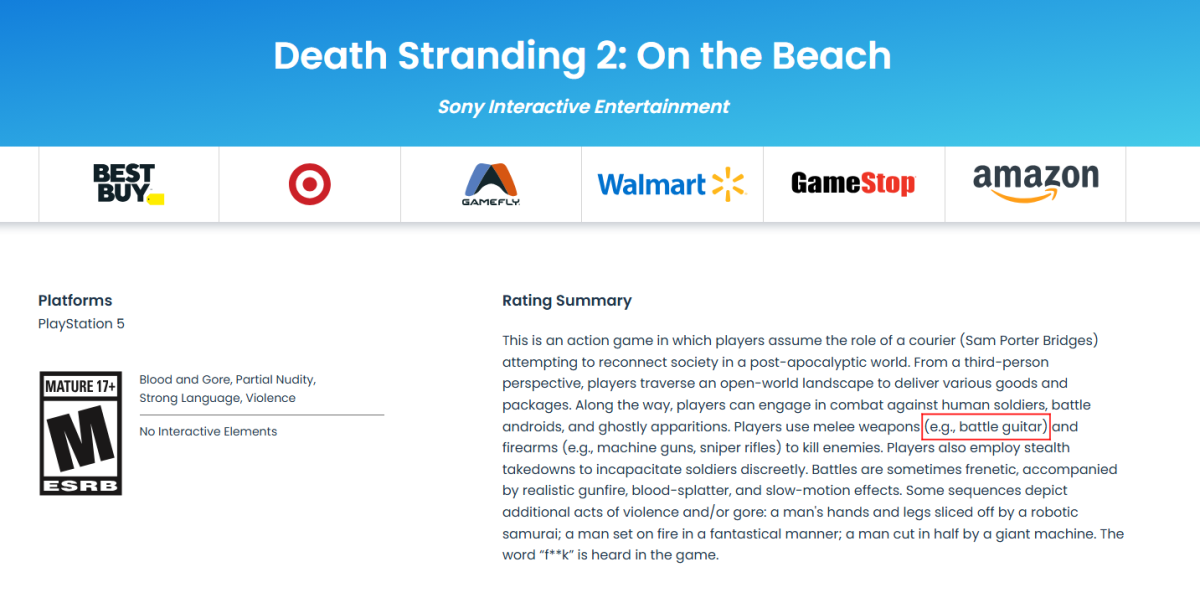 隨著《死亡擱淺2:冥灘之上》(デス・ストランディング2: オン・ザ・ビーチ)即將上市,在美國娛樂軟體分級委員會(Entertainment Software Rating Board;ESRB)釋出的分級摘要資訊中,意外透露本作中包含一項極具話題性的武器——玩家將能使用「戰鬥吉他」作為近戰工具,這項資訊迅速引起粉絲關注與熱議。