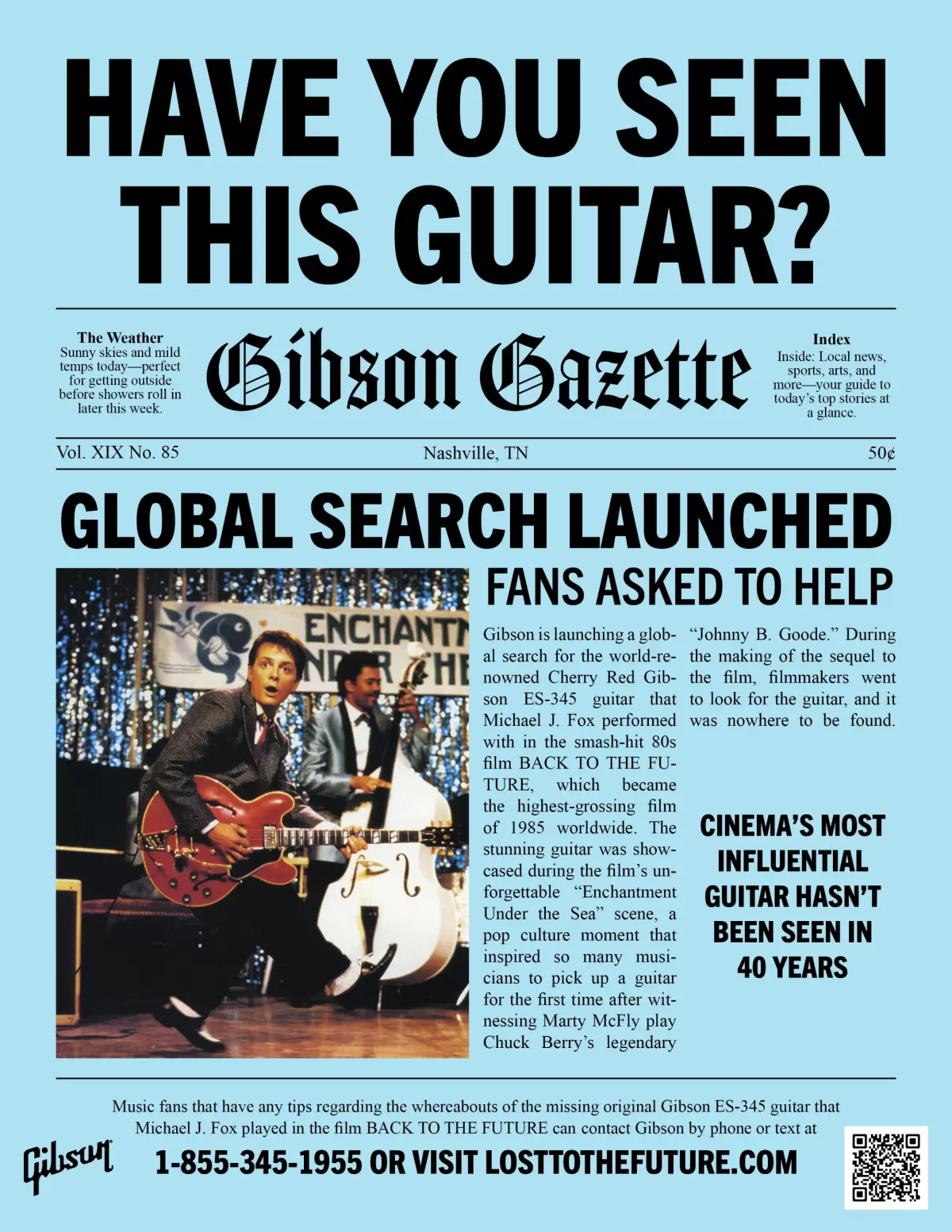 美國知名吉他品牌 Gibson 近日宣布,正式展開尋找電影《回到未來》(Back to the Future)中由麥可·J·福克斯(Michael J. Fox)扮演的主角「馬蒂·麥佛萊」,在舞會上演奏的經典紅色 Gibson ES-345 電吉他。這把吉他自電影拍攝完成後便下落不明, Gibson 希望透過全球尋找行動,找回這件電影史上的珍貴道具。