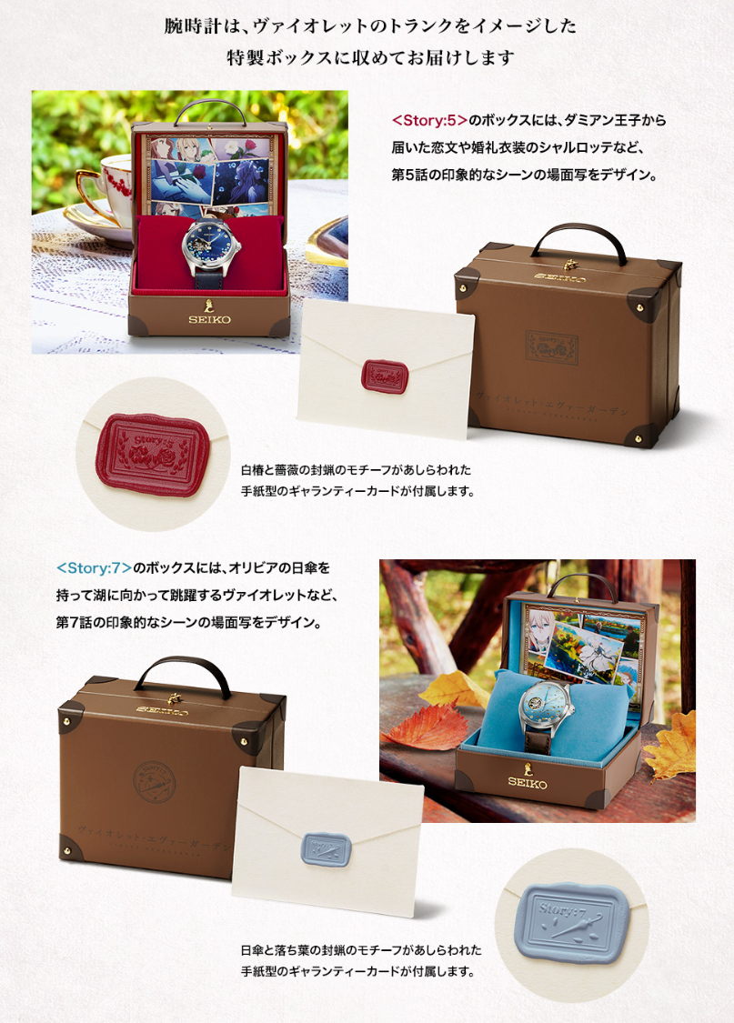這款腕錶不只本體充滿誠意,連包裝也十分講究:特製收藏盒設計仿照薇爾莉特的旅行皮箱,打開就像踏入劇中世界。盒內還印有劇中場景圖,動畫第五話與第七話款各有對應的感人畫面。附上信件造型的保證卡還配上封蠟,像是親手收到薇爾莉特寫來的信一樣,滿滿儀式感!
