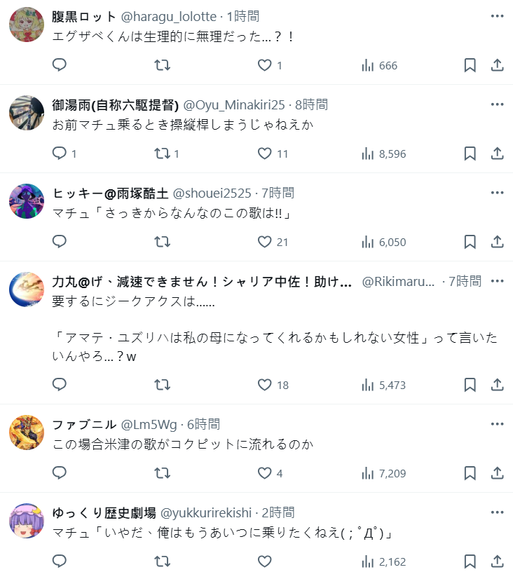 這巧妙結合也讓網友大笑不已,表示 : 「難怪艾格沙貝開不了GQuuuuuuX,生理上無法接受阿...」、「瑪秋 :『剛剛那首歌到底是什麼』」、「這時侯駕駛艙放的想必是米津玄師的歌了吧 ! 」。