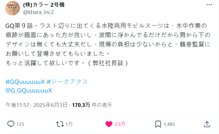 這邊庵野秀明再透過 khara 官方 X 解釋,第九話裡,最後出現的那些水陸兩用機體,其實是因為我們覺得畫面裡如果有點「剛完成水下作業的痕跡」會更有感覺。