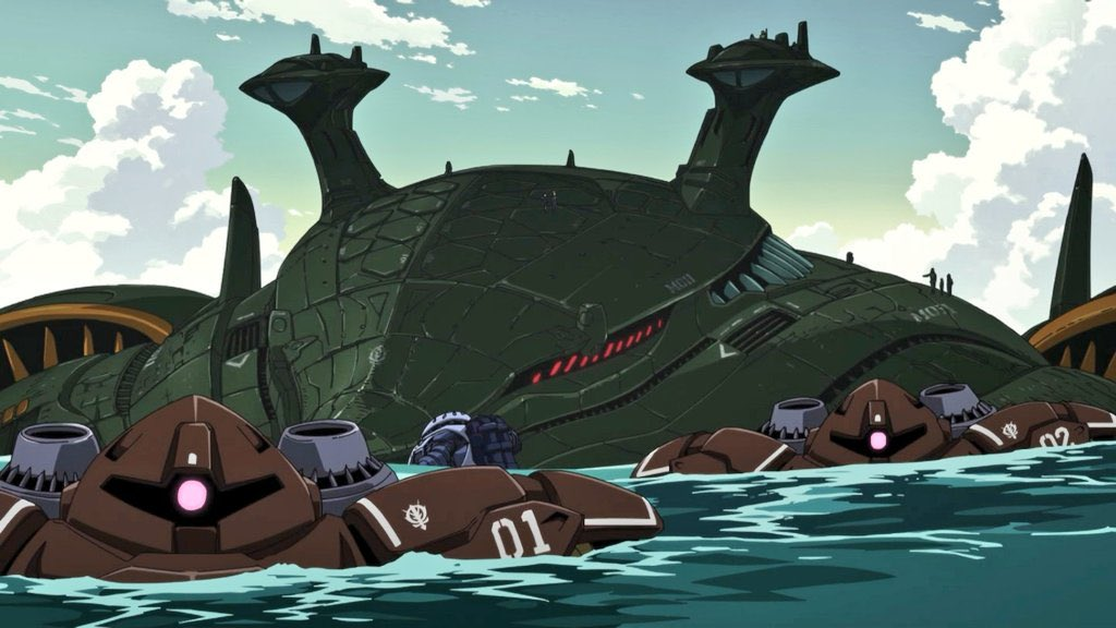 另外,在第九話末段打撈起「雪倫的薔薇」的 MA 時,也有出現了數架讓鋼彈老粉絲熟悉的吉翁軍水陸兩用 MS,看來有葛克、茲寇克代表的瘋狂漁人隊(マッドアングラー隊)機體登場,讓不少觀眾大為驚喜,原來吉翁水戰部門還存活 !