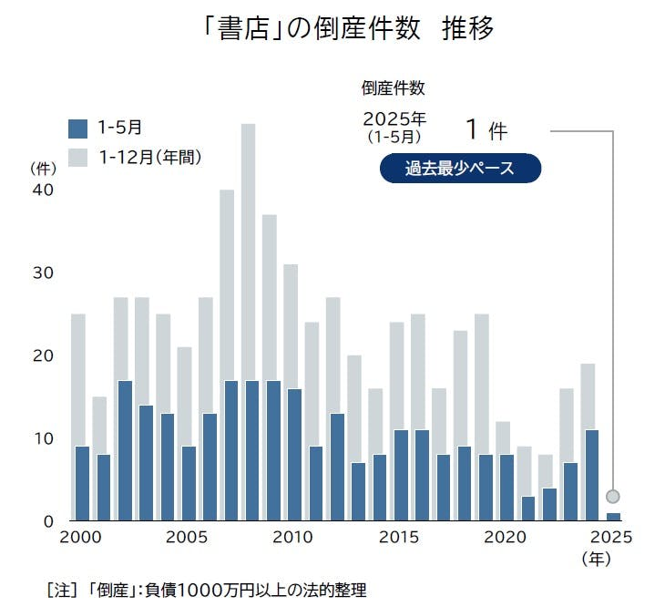 不過近日日本知名的商業調查機構「帝國資料銀行」( 帝国データバンク ) 在公布了今年 1 月到 5 月期間的書店倒閉動向。根據調查,今年倒閉的書店數量明顯驟減,創下歷年來最低的節奏,到底是發生了什麼事情呢。