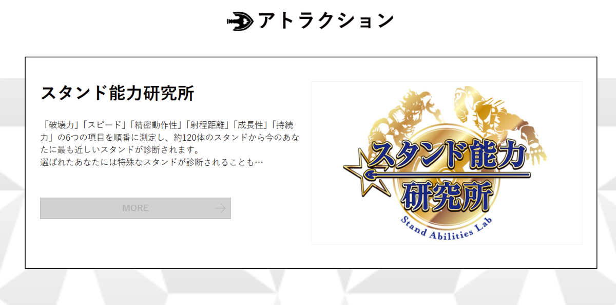 會依序測量「破壞力」、「速度」、「精密操作性」、「射程距離」、「成長性」、「持續力」這六項能力值,從大約120個替身中,找出跟你目前狀態最接近的替身!