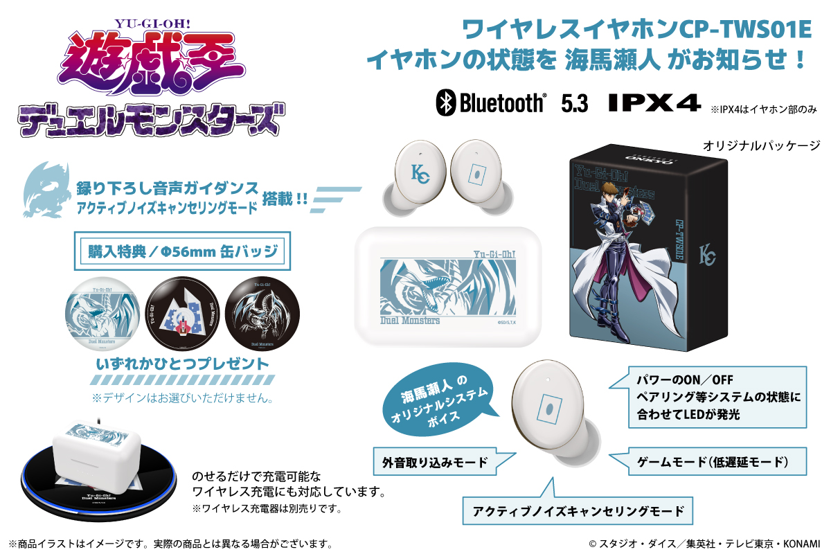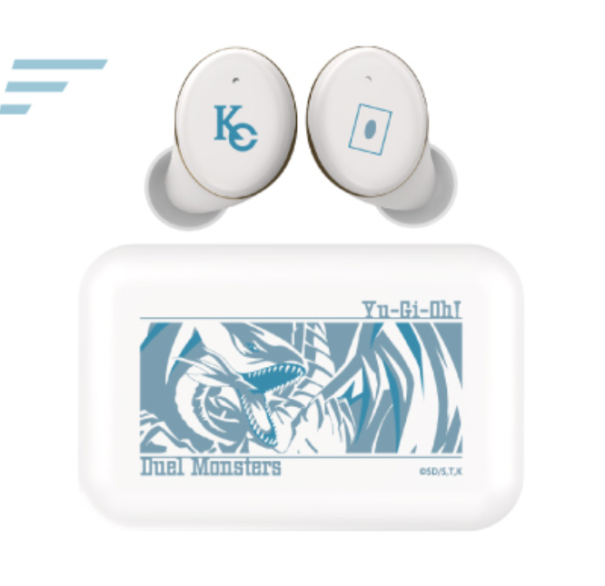 設計元素上,充電收納盒蓋上印有海馬瀨人的最愛卡片「青眼白龍」,耳機本體左右還有代表「海馬娛樂集團」的 KC 字樣跟卡牌背面圖案 。