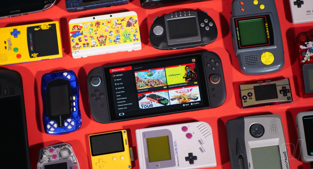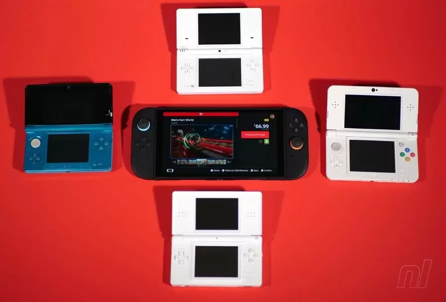 遊戲媒體《Nintendo Life》在曬出一系列實機對比,將 Switch 2 與歷代掌機一同拍攝,提供清楚的視覺參照。雖然這份比對未能涵蓋所有經典掌機(如 Atari Lynx 和 TurboExpress),但仍囊括多數市面知名產品,對照豐富。
