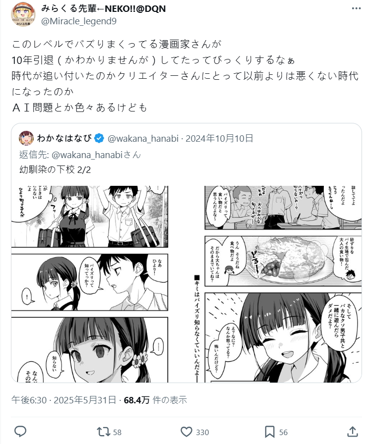 後續漫畫家「わかなはなび」也轉推該文,指出 :