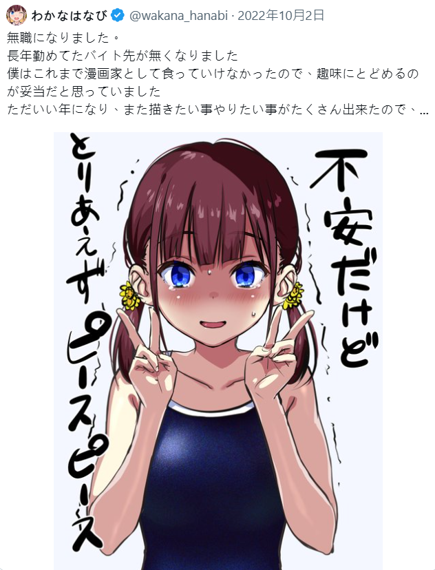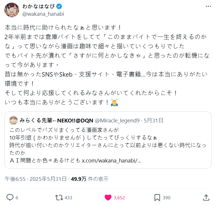 曾在倉庫打工維生、甚至一度變得身無分文的日本漫畫家「わかなはなび」,近日在社群平台X(前Twitter)分享自己的心路歷程,透露自己是在打工的公司倒閉、陷入人生低谷後,決定背水一戰投入創作,如今終於能靠漫畫養活自己,讓不少網友感動直呼:「這是時代追上創作者的最佳例子!」